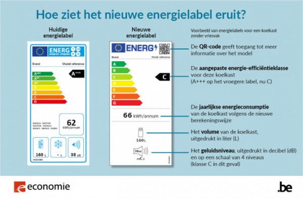 Vanaf 1 maart dit jaar moeten winkels en webshops die huishoudelijke apparaten verkopen, nieuwe energielabels tonen voor wasmachines, wasdroogcombi’s, vaatwassers, koelkasten, vriezers, wijnbewaarkasten en beeldschermen. In september worden de nieuwe labels voor lampen ingevoerd en in de komende jaren voor andere apparaten, zoals wasdrogers, airco’s en ovens. Een helder filmpje met uitleg door Milieu Centraal vind je hier.